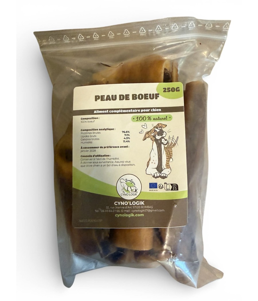🐄 Des lamelles de peaux de boeuf 250g : une friandise avec une durée de mastication interessante riche en protéines pour seulement 4,8% de matière grasse !
