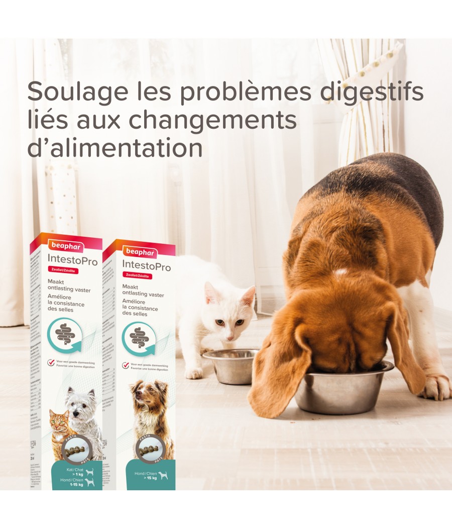 Intestopro aide également à soulager les troubles gastro-intestinaux des chats et des chiens dès l’âge de 4 semaines et à partir de 1 kg.