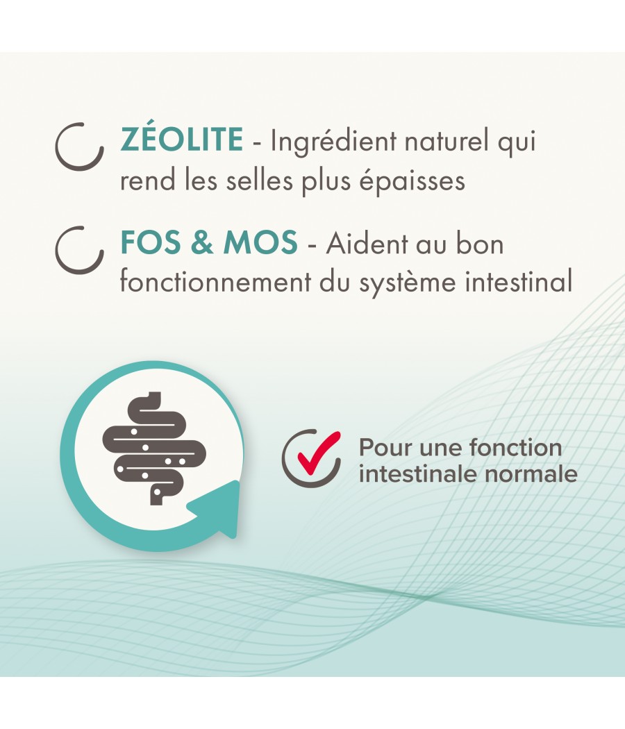 Grâce à la Zéolite, qui est un ingrédient naturel, il rend les selles plus épaisses en absorbant l'excès d'humidité. Ce produit contient également de l’hydroxyde d’aluminium, des FOS et MOS, qui sont connus pour leurs vertus sur le système intestinal.